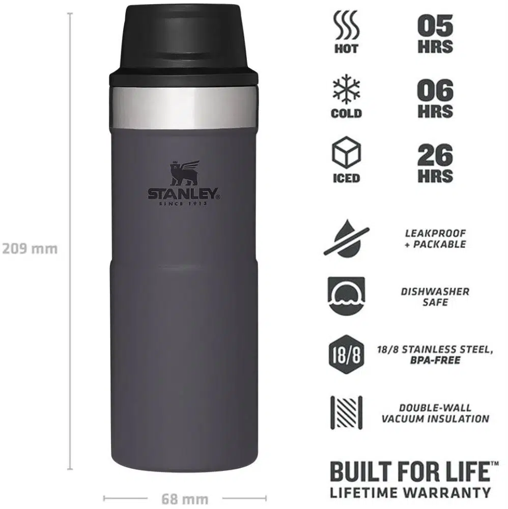 Stanley Trigger Action termos bardak, çoğu kahve makinesinin altına ve çoğu bardak tutucusuna sığacak şekilde tasarlanmıştır, böylece günlük işe gidip gelirken yanınızda olabilir. Çift cidarlı vakum yalıtımı, en sevdiğiniz çay, kahve veya diğer sıcak içeceklerinizi 5 saat sıcak, 6 saat soğuk ve 26 saat buzlu tutar. Şehir içi ve açık hava maceralarınız için mükemmel bir arkadaştır.