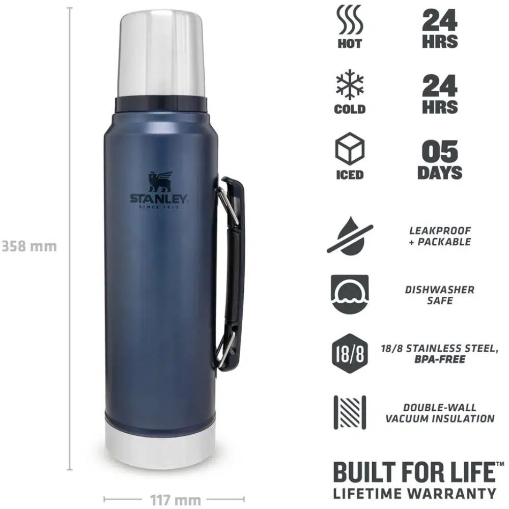 Paslanmaz çelik vakum yalıtımına sahip olan Stanley çift duvarlı Klasik 1 Lt termos, sıcak ve soğuk içecekleri 24 saate kadar (buzlu içecekleri 5 gün) korumak için mükemmeldir. Doğal olarak BPA içermeyen 18/8 paslanmaz çelikten üretilen bu şık termos, sızdırmaz ve paslanmaya karşı dayanıklıdır, bu da onu hayal kırıklığına uğratmayacak dayanıklı bir seçenek haline getirir. Stanley 1 Lt termos tek elle tutulabilecek kadar incedir, içeceğinizi daha kolay dökmeniz için, çevir – dök tıpası vardır. Yalıtımlı kapak, bardak olarak kullanılabilmektedir. Diğer özellikler arasında bardak olarak da kullanılabilen bir kapak ve ömür boyu garanti bulunur.