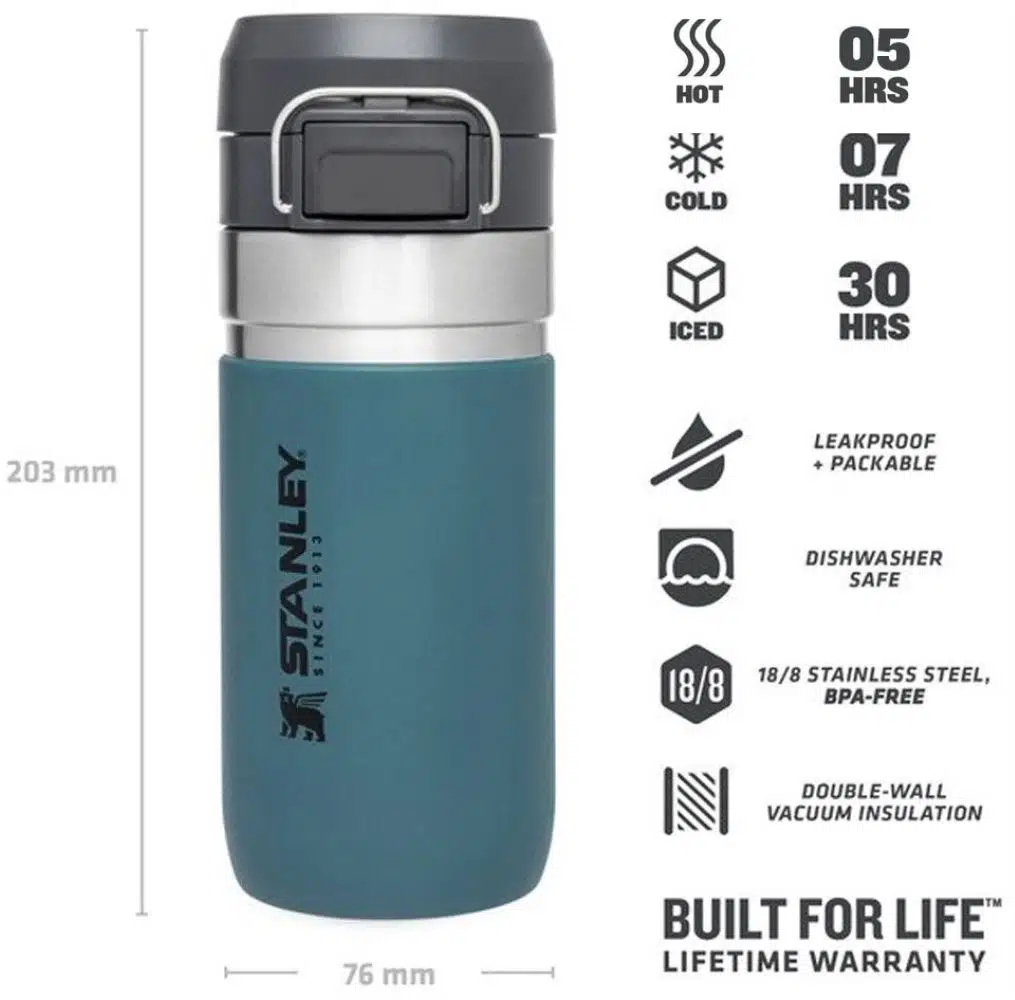 Stanley Quick termosun çift duvar vakumlu yalıtımı içeceklerinizi 5 saat sıcak, 7 saate kadar soğuk, 30 saate kadar buzlu tutar. Sadece düğmesine basın ve açın. Stanley Quick Flip Termos, bir çok bardak tutucu ile uyumludur ve açık hava maceraları için mükemmel bir yol arkadaşıdır. (Farklı renk ve boyut seçenekleri bulunmaktadır.)